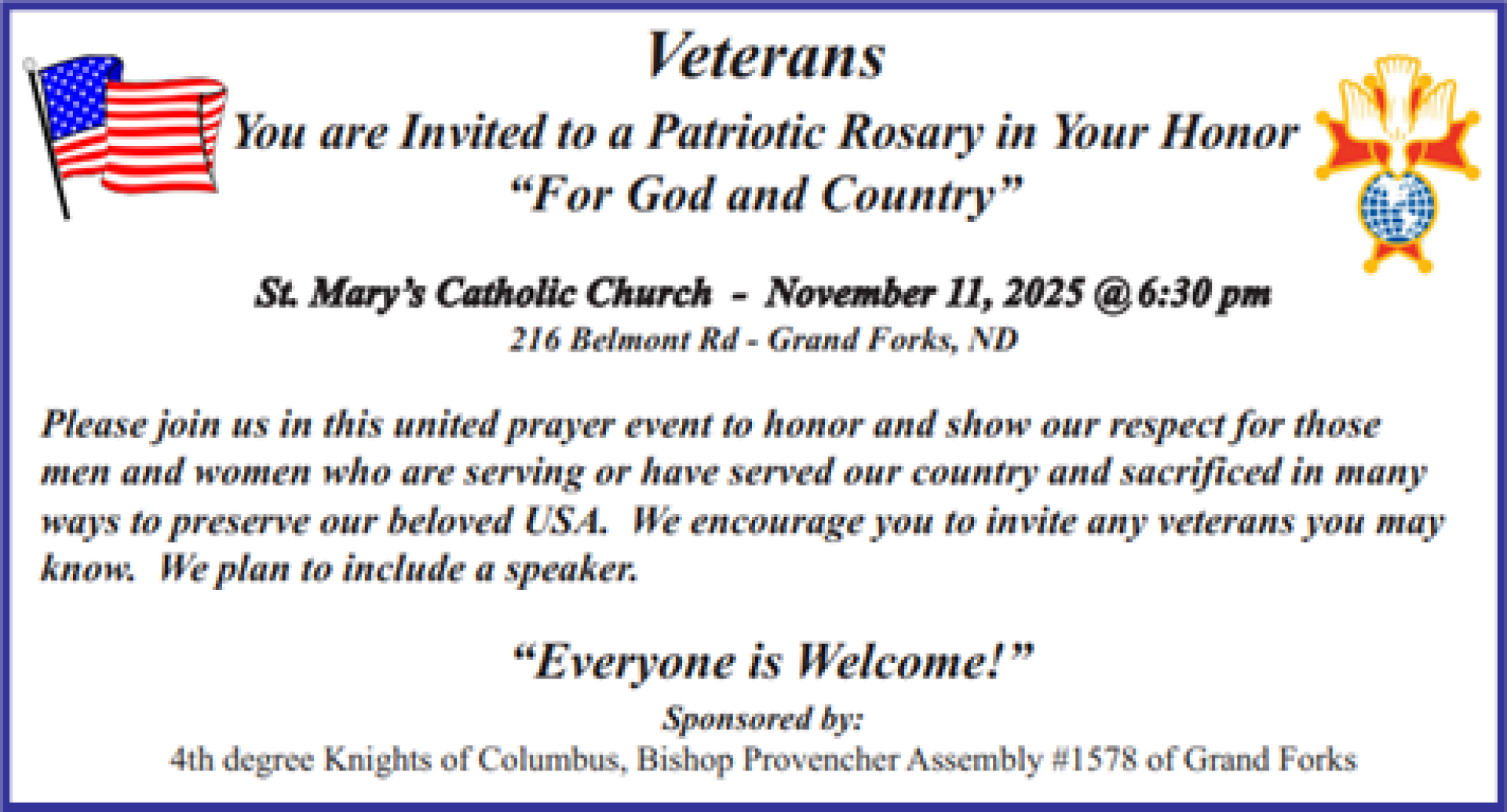 We, the Catholics community of St. Mary's Parish, Grand Forks, North Dakota, declared that by the death and resurrection of Jesus Christ, we have been set free to live as a worshiping, ministering community which proclaims the Good News of Jesus.